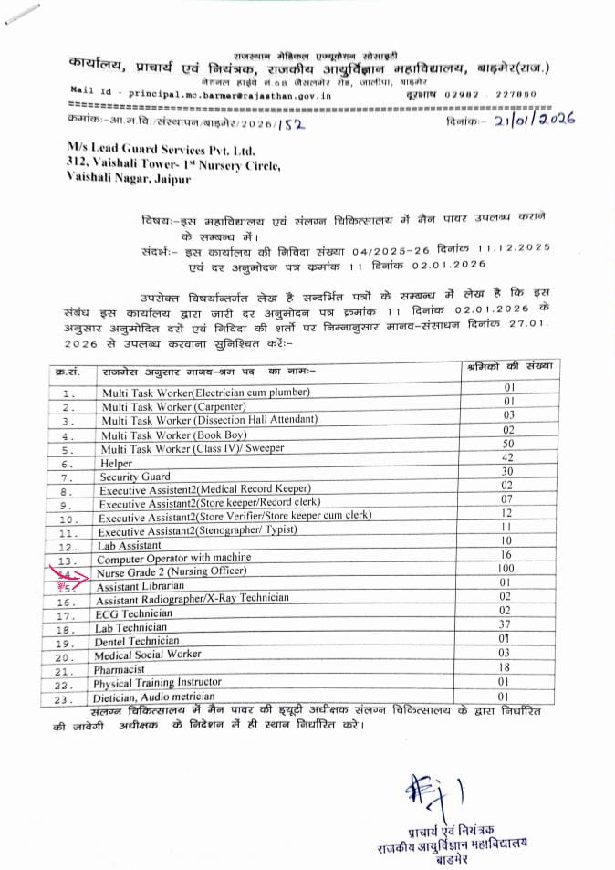 Government Medical College (GMC), Barmer (Rajasthan) has released an official order (Ref No: 152 dated 21/01/2026) instructing the placement agency M/s Lead Guard Services Pvt. Ltd. to provide manpower for various positions. There are a total of 353 vacancies available for posts like Nurse Grade 2, Lab Technician, Computer Operator, Store Keeper, Sweeper, Helper, and Security Guard. These positions are on a Contract/Outsourcing basis (Man Power Supply). 👇 Check full vacancy details below.
